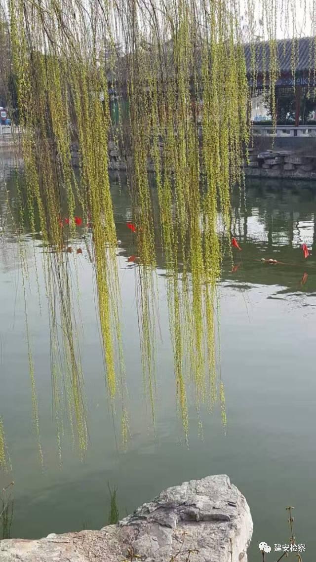 收回目光,望着身旁的垂柳,微吐嫩绿、温润细腻,微风吹过,丝丝摇摆,在暖暖的阳光下,那么柔和,又那么亲切,禁不住轻轻曳动她的枝条,轻抚她的嫩叶,也似乎留住了自己,凝固了时间……