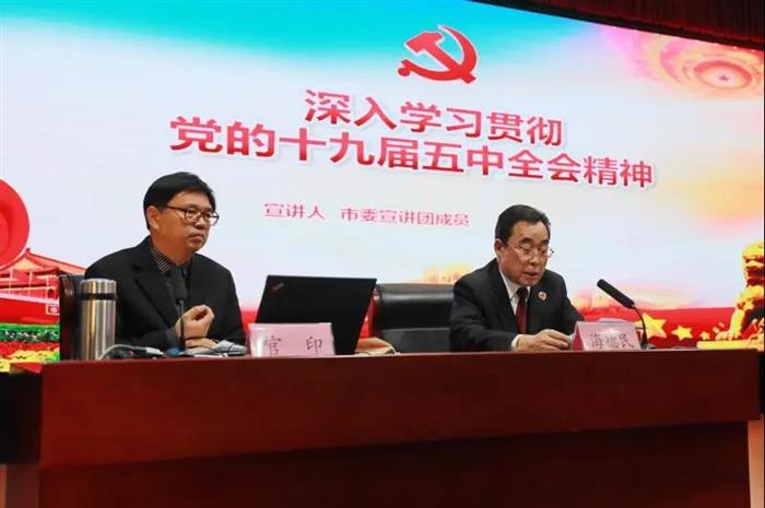 官印局长从深刻认识我国进入新发展阶段的重大意义、有利条件和重要特征,准确把握2035年远景目标和“十四五”时期我国发展的指导方针、主要目标、重点任务,牢牢把握构建新发展格局的战略构想和重要着力点,坚持党的全面领导,动员各方面力量为实现“十四五”规划和2035年远景目标而团结奋斗等四个方面,对党的十九届五中全会内容进行了深度解读,报告主题鲜明、内涵丰富、全面系统、重点突出,既有理论高度、思想深度,又有很强的针对性、实效性,为全体干警深入学习领会、全面准确把握党的十九届五中全会精神具有很强的指导作用。