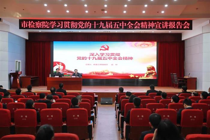 为深入学习贯彻党的十九届五中全会精神,引导全体检察干警领会精神内涵,把握精神实质,把会议确定的各项决策部署和工作要求落到实处,12月16日下午,市院机关举行学习贯彻党的十九届五中全会精神宣讲报告会,党组副书记、副检察长海德民主持会议,市委宣讲团成员、市中级人民法院执行局局长官印作宣讲报告,市院党组成员、检委会专职委员及全体干警参加报告会。