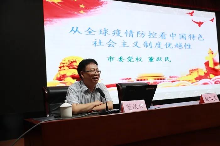 董跃民副教授以《从全球疫情防控看中国特色社会主义制度优越性》为题,从疫情防控的视角,从理论和实践相结合的高度,运用大量翔实的案例和数据,解读了以习近平同志为核心的党中央在面对新冠疫情,牢牢掌握战“疫”的主动权、制胜权,采取果断措施,带领中国人民凝心聚力、万众一心,夺取了疫情防控的阶段性胜利,通过中西方对比,充分显现了坚持党的集中统一领导、坚持以人民为中心的发展思想、坚持全国一盘棋的中国特色社会主义制度的优越性。