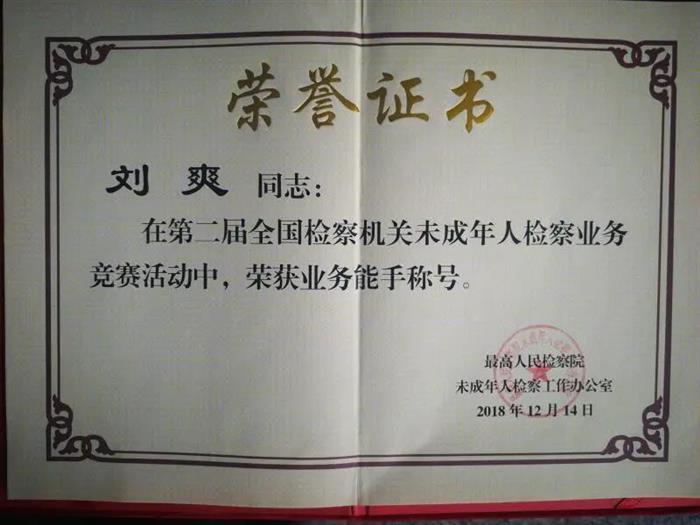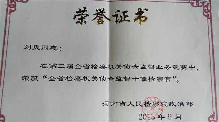 近日,许昌市人民检察院第七检察部三级检察官刘爽被中共河南省委表彰为“省人民满意的政法干警”。