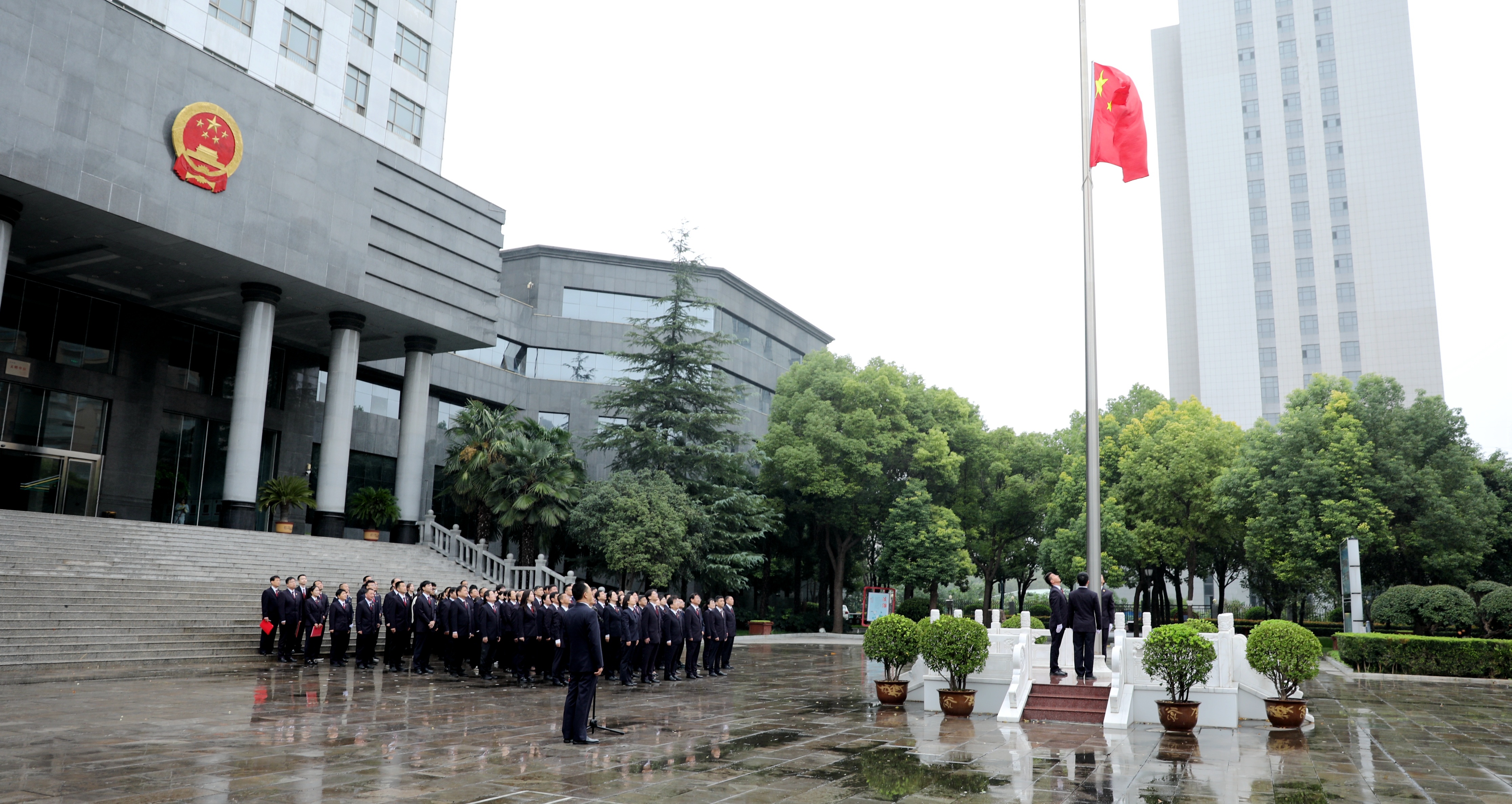 冒着淅沥沥的秋雨,机关全体干警整齐列队。在雄壮的国歌声中,五星红旗冉冉升起,全体干警行注目礼,向伟大祖国致以最崇高敬意!